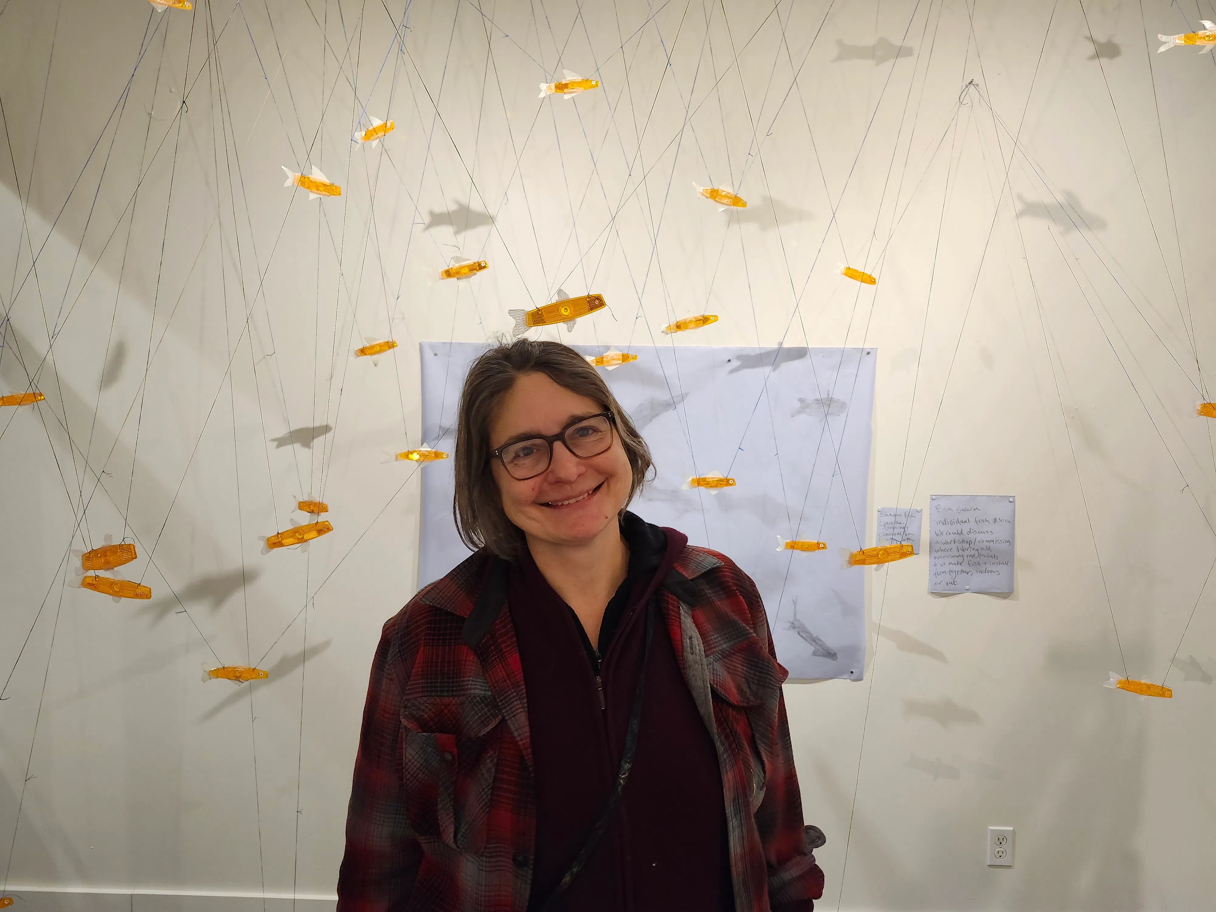 Nicole Bauberger stands in front of a swimming school of bike reflectors as part of her 'Fish and Fire' exhibit. Photo Courtesy: Macklen Linke