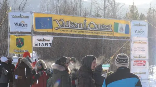 A crowd gathered near the starting line waiting for the first musher to start this year's Yukon Quest. Photo Courtesy of Macklen Linke/CKRW.