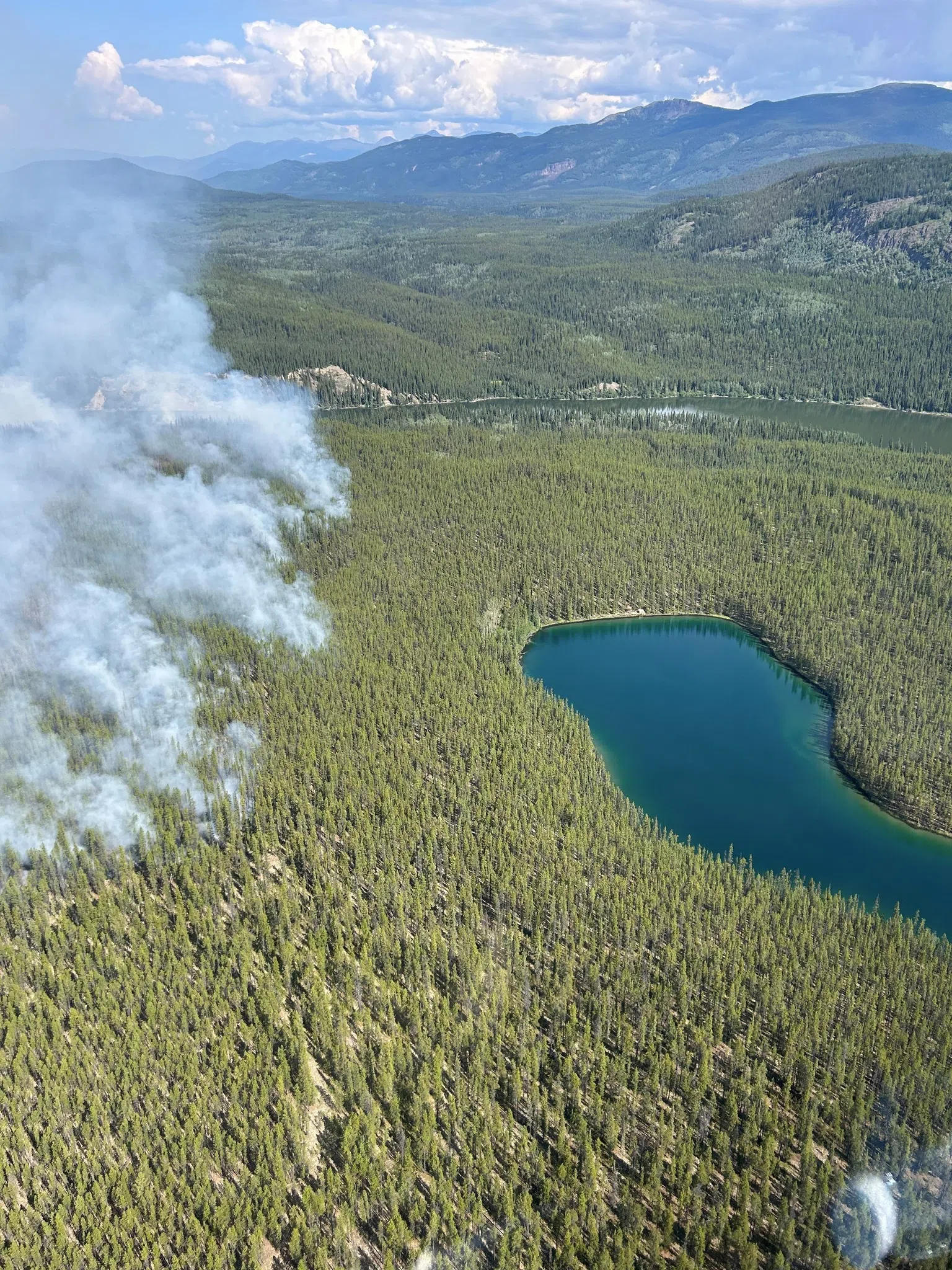 An aerial photo of the fire 56 kilometers east of Whitehorse taken on June 28th. Photo Courtesy of Yukon Protective Services/Facebook.