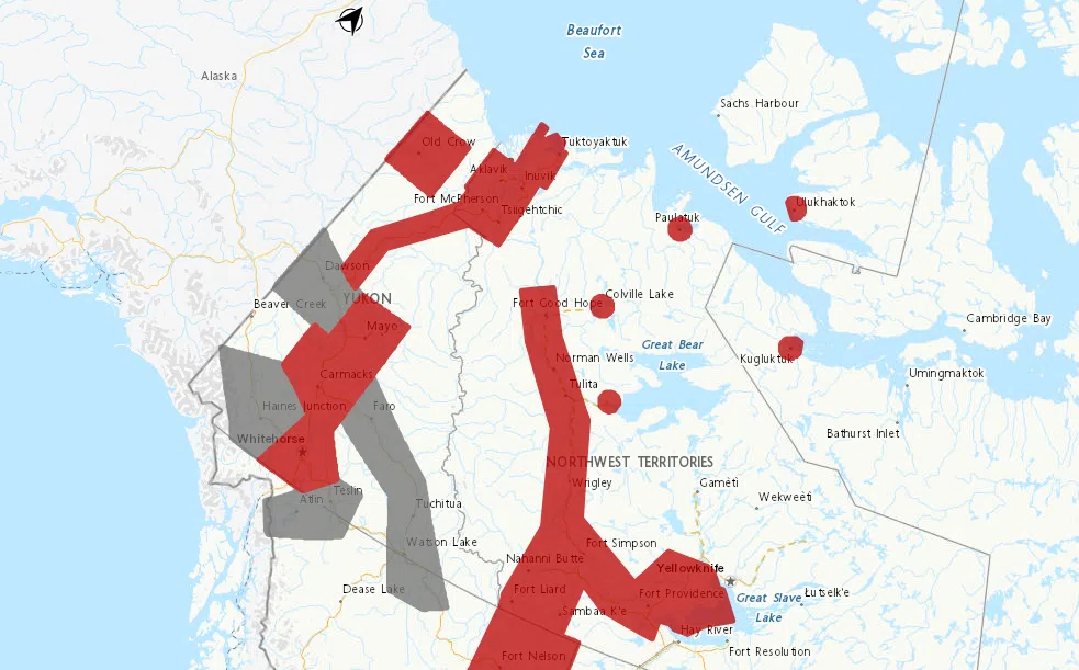 Heat warnings appearing in red and special weather statements in grey appear across the Yukon and parts of the NWT as the North experiences temperatures above seasonal averages. Screenshot of map on Environment Canada website as seen on August 7th.