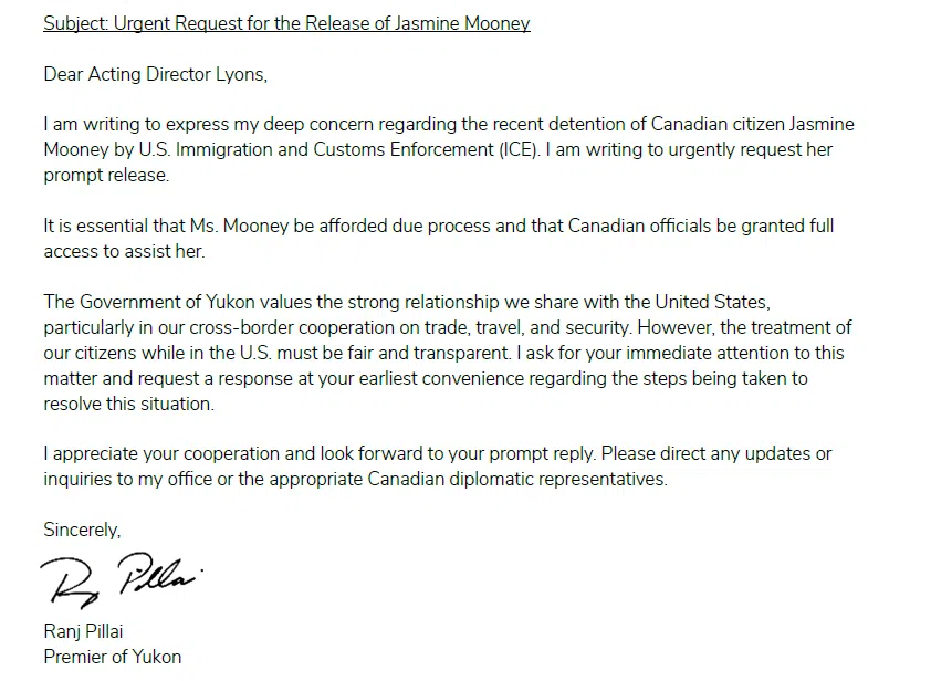 WHITEHORSE, YT – Following news that Jasmine Mooney, a Canadian woman with Yukon origins, had been detained by ICE agents at the US-Mexico Border Crossing in San Ysidro, and continues to be held at a detention facility in Arizona, the Yukon’s Premier Ranj Pillai, had personally written Acting Director of U.S. Immigration and Customs Enforcement, Todd M. Lyons, with an urgent request for her release.