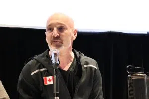 Brendan Hanley speaking at the YFL All Candidates Debate on April 14th. Photo Courtesy of Macklen Linke/CKRW.