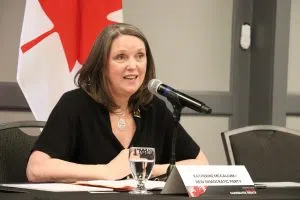NDP candidate Katherine McCallum speaking at the YFL All Candidates Debate on April 14th. Photo Courtesy of Macklen Linke/CKRW.
